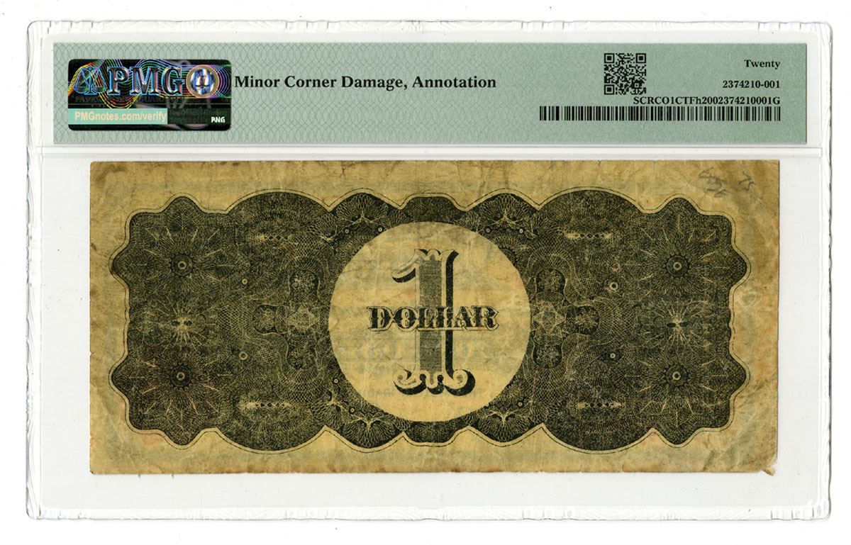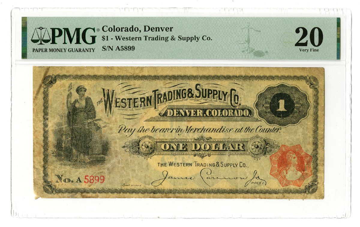 Denver, Colorado, ND (1920s). $1 Issued Banknote, Black printing with allegorical woman at left and red seal at bottom right corner, Back is dark blue with denomination at center, S/N A5899, PMG graded Very Fine 20 with comments "Minor Corner Damage, Annotation."