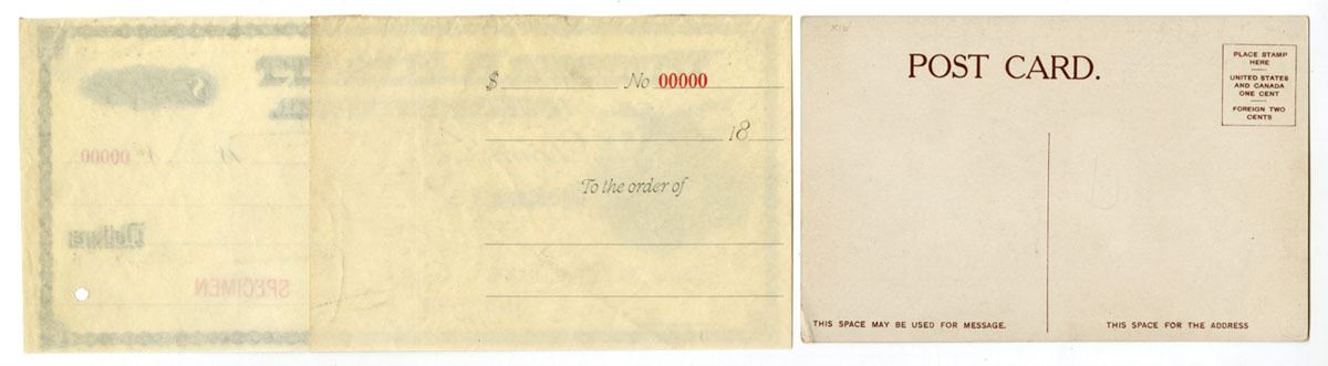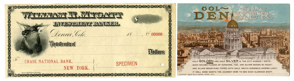 Denver, Colorado..., early 1900s. Lot of 2 items, includes: William R. Mygatt, Investment Banker, Specimen Draft and a color Denver souvenir postcard. The draft is drawn on Chase National Bank, New York, printed by American Bank Note Co., New York, and features an engraved elk vignette at left with ornate green border and bold typography. Red “SPECIMEN” overprint and punch cancellation holes present, with serial number 00000, indicating printer’s sample status. Accompanied by a period “Gold and Silver Denver” postcard depicting the Colorado State Capitol and cityscape, with descriptive verse on reverse. A visually appealing Colorado banking and ephemera pairing combining early Denver financial history and promotional material. Condition ranges from Fine to Very Fine overall, with light toning, minor edge wear, and typical handling. (2). Sold “AS IS” no returns accepted.