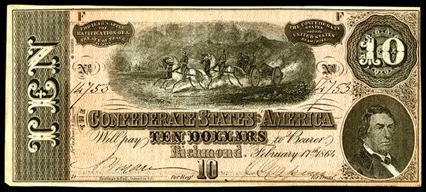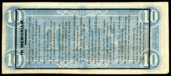 CSA, February 1864 Issued Banknote with "In Memoriam" Overprint on Back. Richmond, VA 1864 $10.00, P-68. Artillery, horsemen pulling cannon, blue back Choice AU.