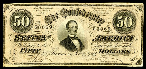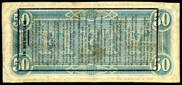 CSA, February 1864 Issued Banknote with "In Memoriam" Overprint on Back. Richmond, VA 1864 $50.00, P-70. Portrait Pres. Jefferson Davis at center, blue back, Choice VF with miniscule edge split on mid right Side.