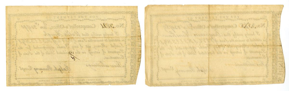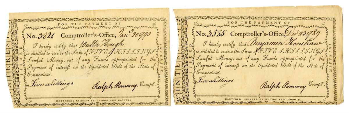 Hartford, Connecticut, 1789-90. Lot of 2 examples of 5 Shillings I/C payments of "Lawful Money out of any Funds appropriated for the Payment of interest on the liquidated Debt of the State of Connecticut." Black text and simple black scroll work border, cut cancelled at center, Both are signed by Ralph Pomeroy as Comptroller and are in VF to XF condition. Ralph Pomeroy was a notable figure in the late 18th century, serving as the Comptroller of Connecticut in 1790. His career began with significant military service during the American Revolutionary War, where he held positions such as first lieutenant and Deputy Quartermaster General for Connecticut. Following the war, Pomeroy engaged in mercantile and manufacturing activities in Hartford. Despite his attempts to secure federal appointments, including requests to George Washington, he remained active in state roles, notably managing Connecticut's finances as Comptroller, where he oversaw state debt payments and other fiscal responsibilities_. Printed by Hudson and Goodwin. (2). Sold "AS IS" no returns accepted.