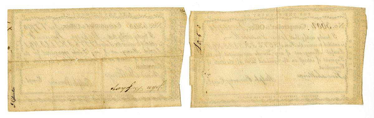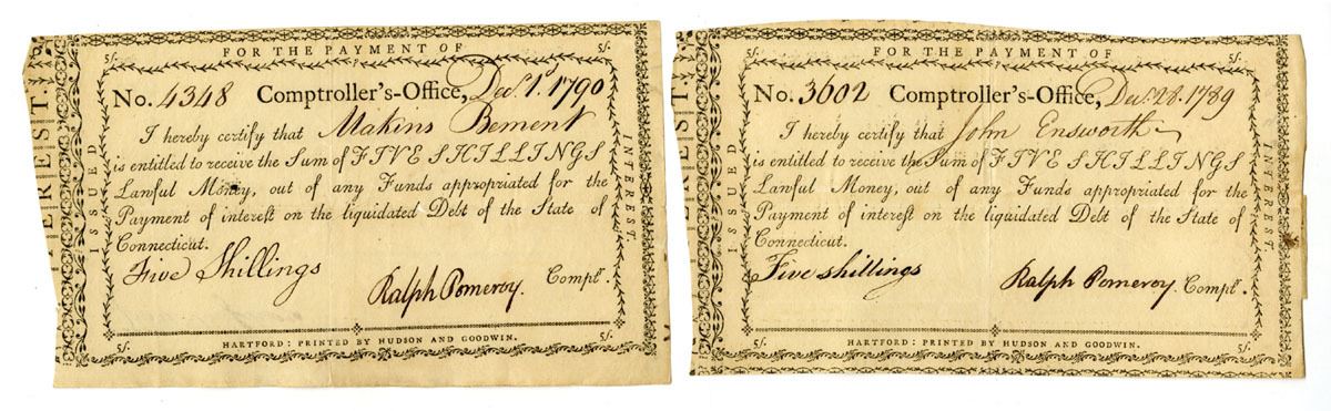 Hartford, Connecticut, 1789-90. Lot of 2 examples of 5 Shillings I/C payments of "Lawful Money out of any Funds appropriated for the Payment of interest on the liquidated Debt of the State of Connecticut." Black text and simple black scroll work border, cut cancelled at center, Both are signed by Ralph Pomeroy as Comptroller and are in VF to XF condition. Ralph Pomeroy was a notable figure in the late 18th century, serving as the Comptroller of Connecticut in 1790. His career began with significant military service during the American Revolutionary War, where he held positions such as first lieutenant and Deputy Quartermaster General for Connecticut. Following the war, Pomeroy engaged in mercantile and manufacturing activities in Hartford. Despite his attempts to secure federal appointments, including requests to George Washington, he remained active in state roles, notably managing Connecticut's finances as Comptroller, where he oversaw state debt payments and other fiscal responsibilities_. Printed by Hudson and Goodwin. (2). Sold "AS IS" no returns accepted.