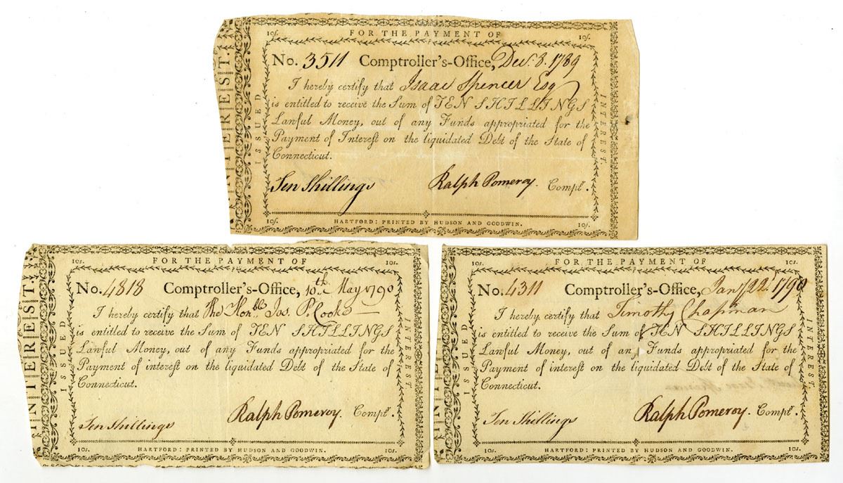 Hartford, Connecticut, 1789-90. Lot of 3 examples of 10 Shillings I/C payments of "Lawful Money out of any Funds appropriated for the Payment of interest on the liquidated Debt of the State of Connecticut." Black text and simple black scroll work border, cut cancelled at center, Both are signed by Ralph Pomeroy as Comptroller and are in VF to XF condition. Ralph Pomeroy was a notable figure in the late 18th century, serving as the Comptroller of Connecticut in 1790. His career began with significant military service during the American Revolutionary War, where he held positions such as first lieutenant and Deputy Quartermaster General for Connecticut. Following the war, Pomeroy engaged in mercantile and manufacturing activities in Hartford. Despite his attempts to secure federal appointments, including requests to George Washington, he remained active in state roles, notably managing Connecticut's finances as Comptroller, where he oversaw state debt payments and other fiscal responsibilities_. Printed by Hudson and Goodwin. (2). Sold "AS IS" no returns accepted.