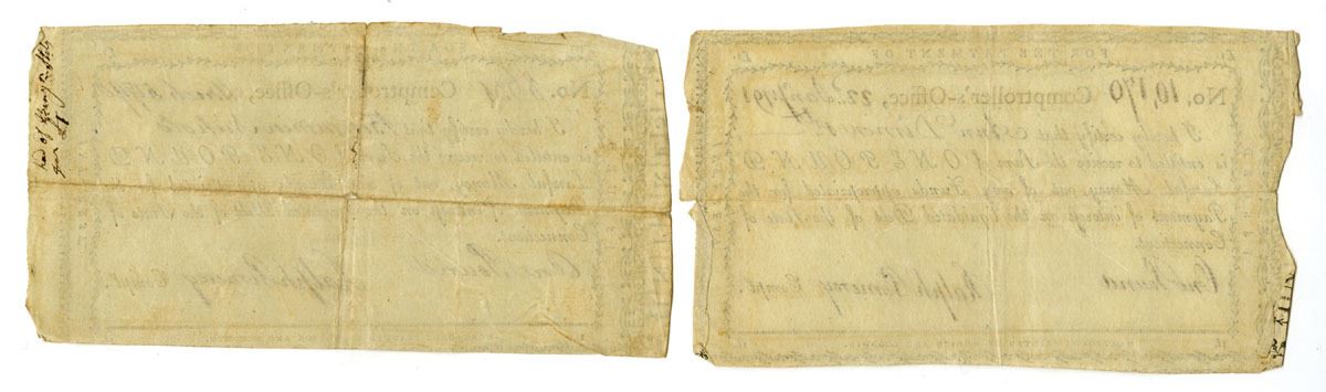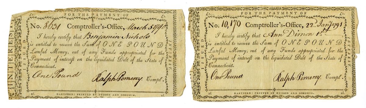 Hartford, Connecticut, 1790-91. Lot of 2 examples of 1 Pound I/C payments of "Lawful Money out of any Funds appropriated for the Payment of interest on the liquidated Debt of the State of Connecticut." Black text and simple black scroll work border, cut cancelled at center, Both are signed by Ralph Pomeroy as Comptroller and are in VF to XF condition. Ralph Pomeroy was a notable figure in the late 18th century, serving as the Comptroller of Connecticut in 1790. His career began with significant military service during the American Revolutionary War, where he held positions such as first lieutenant and Deputy Quartermaster General for Connecticut. Following the war, Pomeroy engaged in mercantile and manufacturing activities in Hartford. Despite his attempts to secure federal appointments, including requests to George Washington, he remained active in state roles, notably managing Connecticut's finances as Comptroller, where he oversaw state debt payments and other fiscal responsibilities_. Printed by Hudson and Goodwin. (2). Sold "AS IS" no returns accepted.