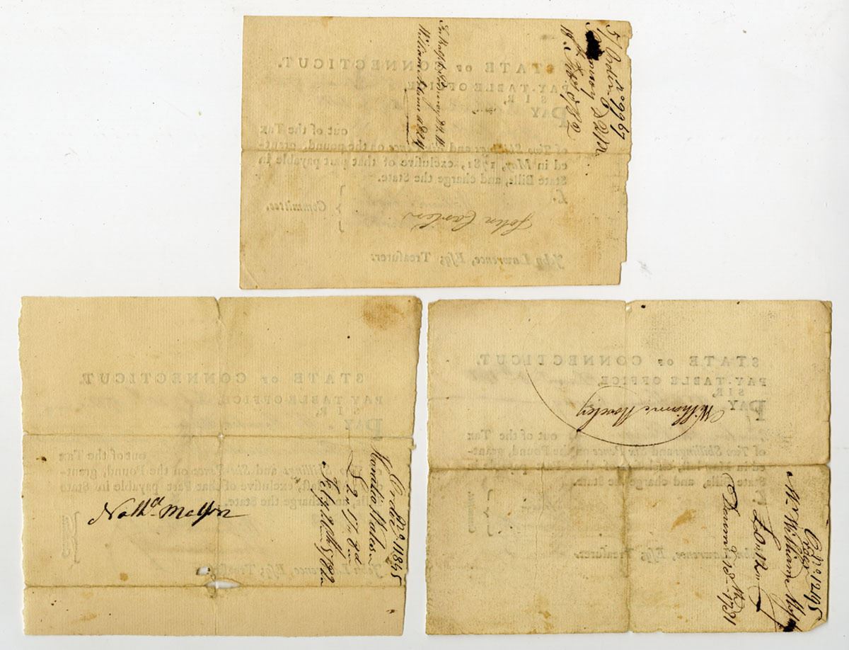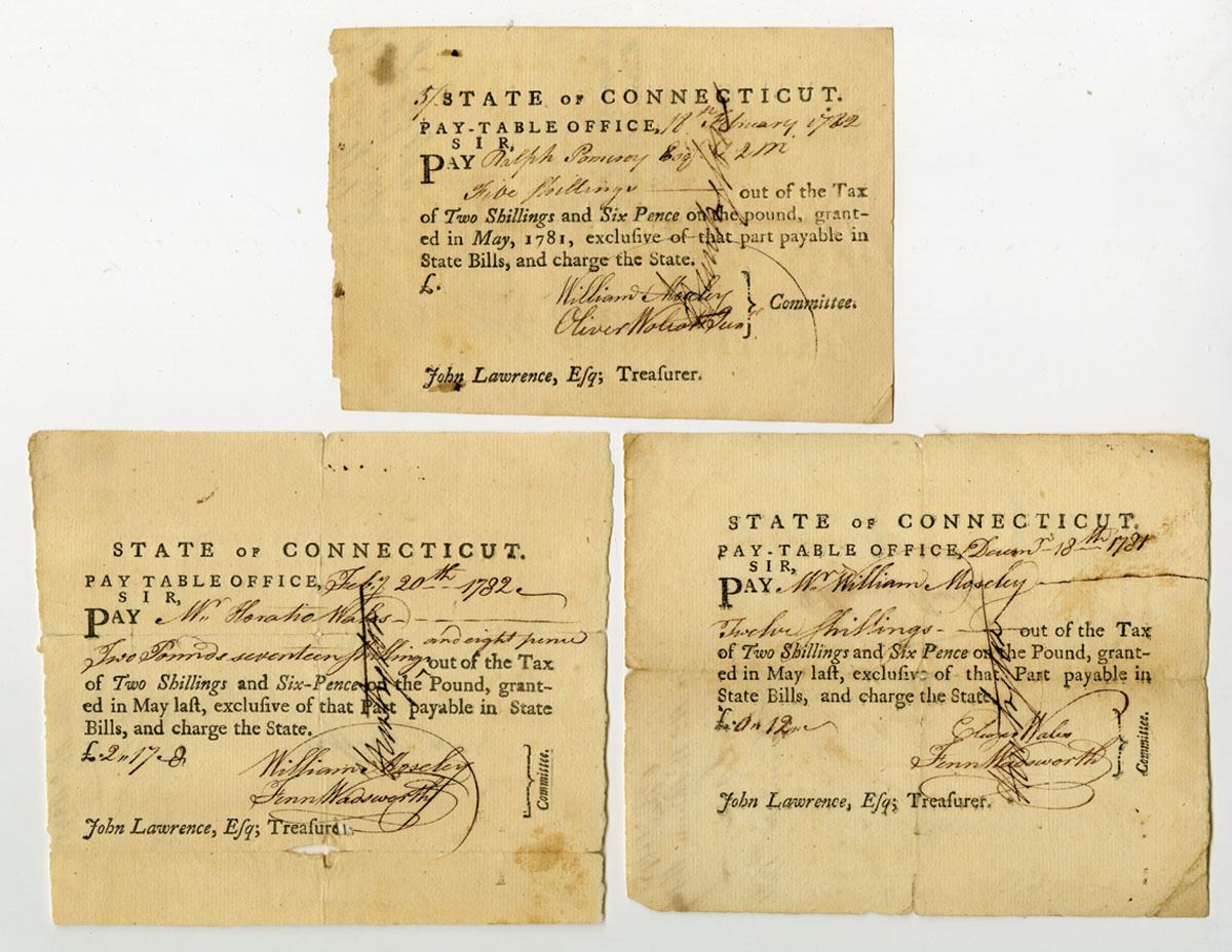 Hartford, Connecticut, 1781-82. Lot of 3 Tax Pay Orders Issued by the Pay-Table Office. Black print, handwriting, and signatures, Issued to Ralph Pomeroy; William Moseley; and Horatio Wales, respectively. Trio includes signatures from early Connecticut figures such as Fenn Wadsworth, William Moseley, Oliver Wolcott Jr. and more. William Moseley (1755-1824) later would serve in the Connecticut state senate. He was also the Director of the Hartford National Bank from 1797 to 1815. Fenn Wadsworth (1750/51-1785) was a brigade major to General James Wadsworth from 1776 to 1779. Fine-VF condition, one with a pair of holes near bottom center. (3)