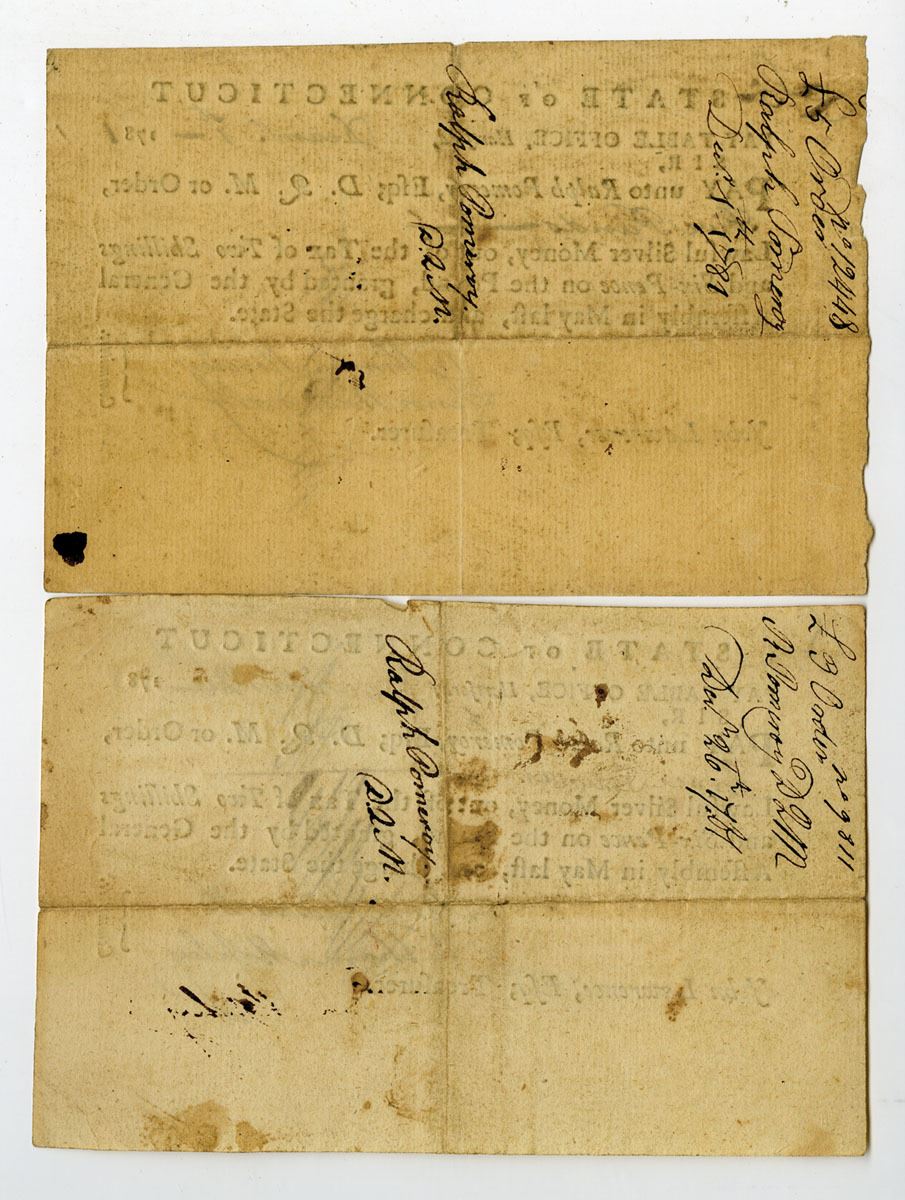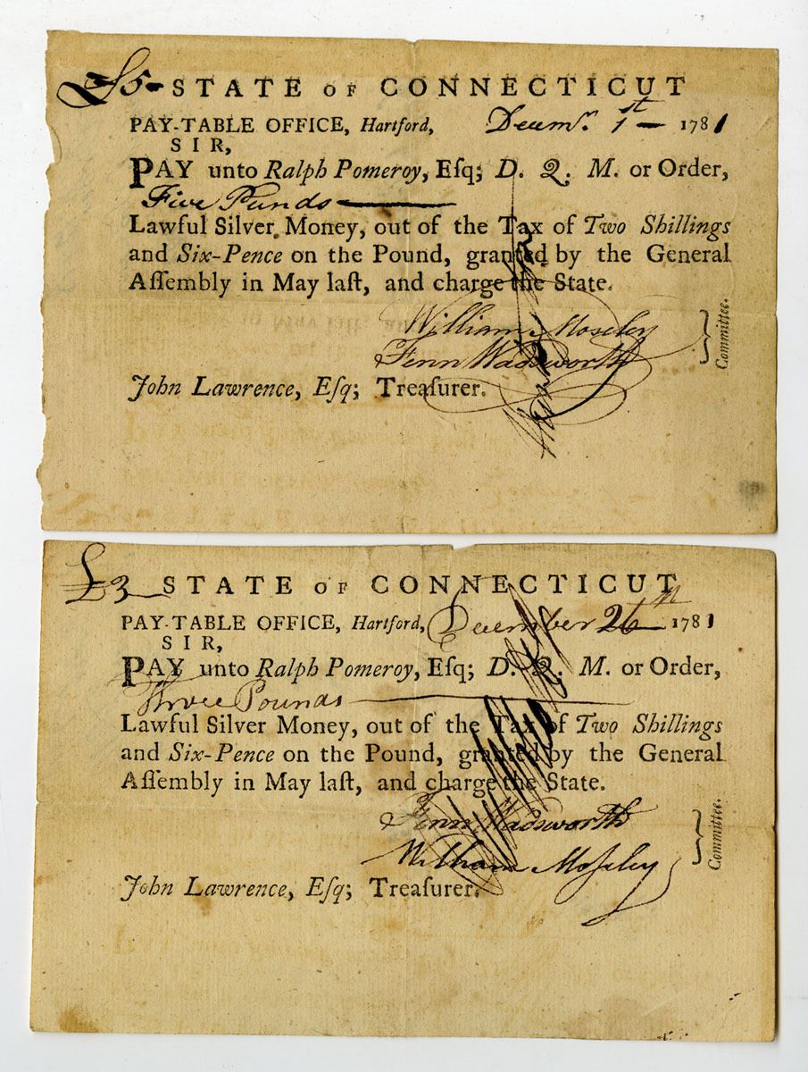 Hartford, Connecticut, 1781. Lot of 2 Tax Pay Orders Issued by the Pay-Table Office. Black print with black handwriting and signatures, both issued to Ralph Pomeroy for various sums of "Lawful Silver Money........granted by the General Assembly in May last, and charge the State." Signed by early Connecticut figures such as Fenn Wadsworth, William Moseley, and Oliver Wolcott Jr. Fenn Wadsworth (1750/51-1785) was a brigade major to General James Wadsworth from 1776 to 1779. William Moseley (1755-1824) later would serve in the Connecticut state senate. He was also the Director of the Hartford National Bank from 1797 to 1815. Oliver Wolcott Jr. (1760-1833) was the second United States Secretary of the Treasury, a judge of the United States Circuit Court for the Second Circuit, and the 24th Governor of Connecticut. VF condition. Sold "AS IS" no returns accepted. (2)