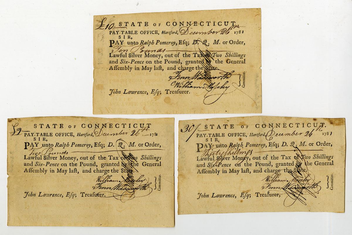 Hartford, Connecticut, 1781. Lot of 3 Tax Pay Orders Issued by the Pay-Table Office. Black print with black handwriting and signatures, all issued to Ralph Pomeroy for sums "granted by the General Assembly in May last, and charge the state." All are signed by William Moseley and Fenn Wadsworth, two with signatures from Samuel Wyllys. William Moseley (1755-1824) later would serve in the Connecticut state senate. He was also the Director of the Hartford National Bank from 1797 to 1815. Fenn Wadsworth (1750/51-1785) was a brigade major to General James Wadsworth from 1776 to 1779. Samuel Wyllys (1739-1823) was an American military officer in the American Revolution, Connecticut politician, and a member of the Wyllys–Haynes family. VF condition. Sold "AS IS" no returns accepted. (3)