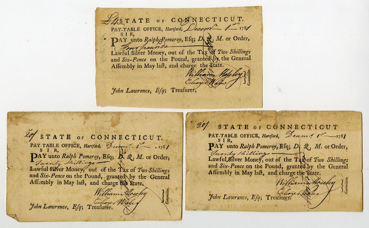Hartford, Connecticut, 1781. Lot of 3 Tax Pay Orders Issued by the Pay-Table Office. Black print, handwriting, and signatures, all issued to Ralph Pomeroy for sums "granted by the General Assembly in May last, and charge the state." All are signed by William Moseley, Eleazer Wales, and Jedidiah Huntington. William Moseley (1755-1824) later would serve in the Connecticut state senate. He was also the Director of the Hartford National Bank from 1797 to 1815. Jedediah Huntington (1743-1818), was an American general in the Continental Army during the American Revolutionary War. After the war, he served in numerous civilian posts. Fine condition with some toning around margins. Sold "AS IS" no returns accepted. (3)