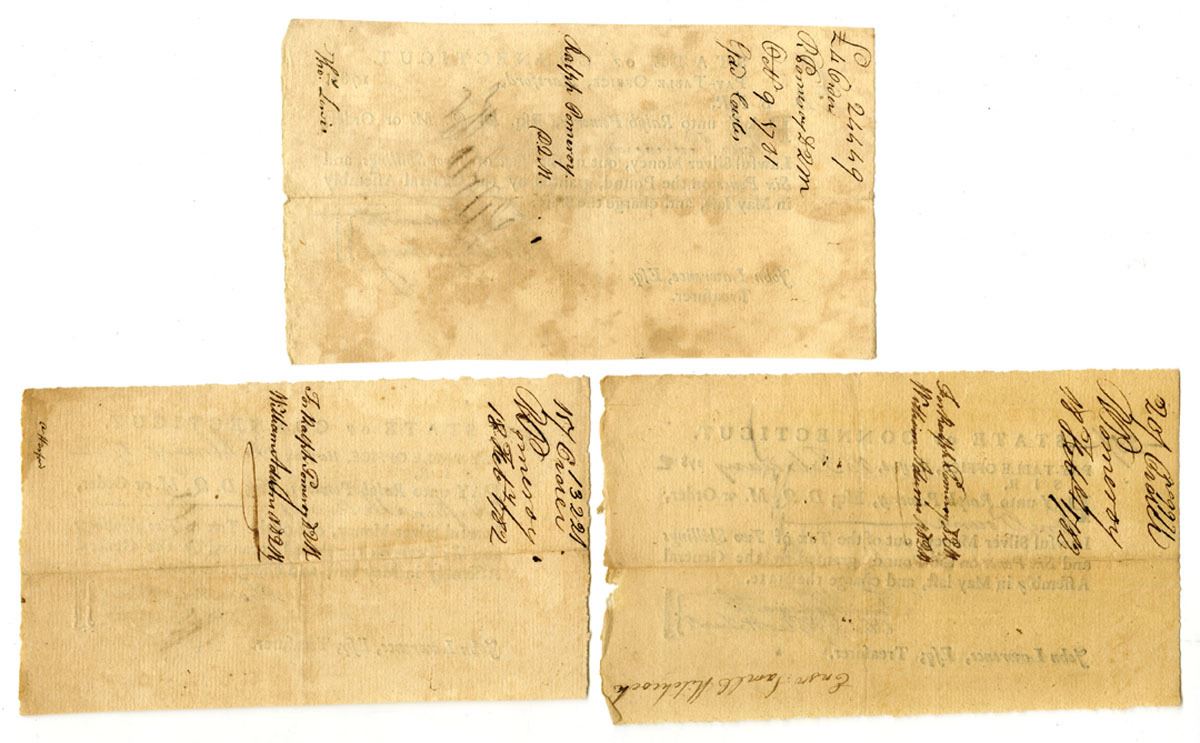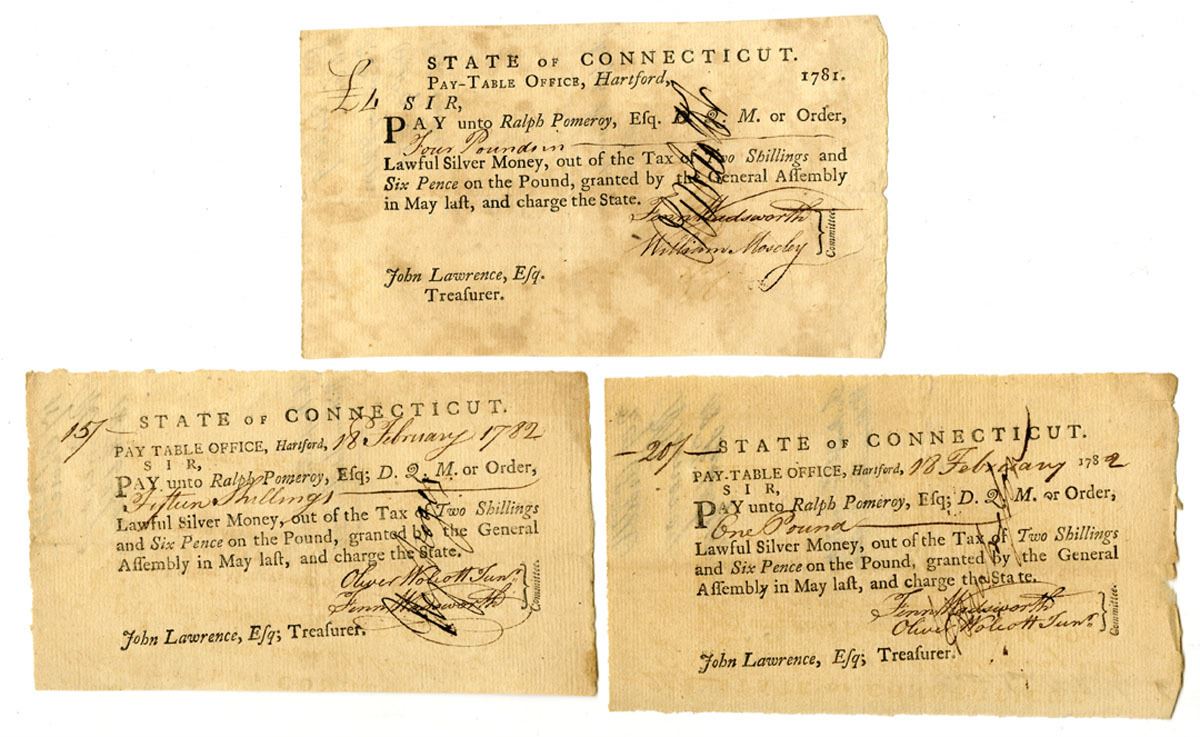 Hartford, Connecticut, 1781 to 1782. Lot of 3 Tax Pay Orders Issued by the Pay-Table Office. Black print, handwriting, and signatures, all issued to Ralph Pomeroy for sums "granted by the General Assembly in May last, and charge the state." All are signed by Fenn Wadsworth and two are signed by Oliver Wolcott Jr. and the last signed by William Mosely. Fenn Wadsworth (1750/51-1785) was a brigade major to General James Wadsworth from 1776 to 1779. He fought in many battles during that time, but his failing health forced him to leave active service. Oliver Wolcott Jr. (January 11, 1760 - June 1, 1833) was the second United States Secretary of the Treasury, a judge of the United States Circuit Court for the Second Circuit, and the 24th Governor of Connecticut. He was a member of the Pay-Table Committee for several years, and was a commissioner to settle claims of Connecticut against the United States from 1784 to 1788. When Wolcott died in 1833 in New York City, he was the last surviving cabinet member of the Washington administration. William Moseley (1755-1824) later would serve in the Connecticut state senate. (3). Sold "AS IS" no returns accepted.