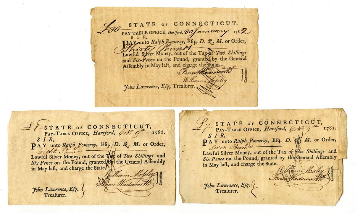 Hartford, Connecticut, 1781-82. Lot of 3 Tax Pay Orders Issued by the Pay-Table Office, Black print, handwriting, and signatures, All are issued to Ralph Pomeroy and signed by early Connecticut figures Fenn Wadsworth and William Moseley. William Moseley (1755-1824) later would serve in the Connecticut state senate. He was also the Director of the Hartford National Bank from 1797 to 1815. Fenn Wadsworth (1750/51-1785) was a brigade major to General James Wadsworth from 1776 to 1779. The Pay-Table (also known as the Committee of Four) managed Connecticut's military finances during the Revolutionary War. Financing the Revolution laid a heavy burden upon each colony, especially those which balked at levying taxes. In order to meet immediate needs, such as wages, the colonies relied upon wealthy revolutionists, foreign loans, and taxes and gifts from abroad. Issuing notes such as these was only a temporary solution. All are in VF condition. (3).