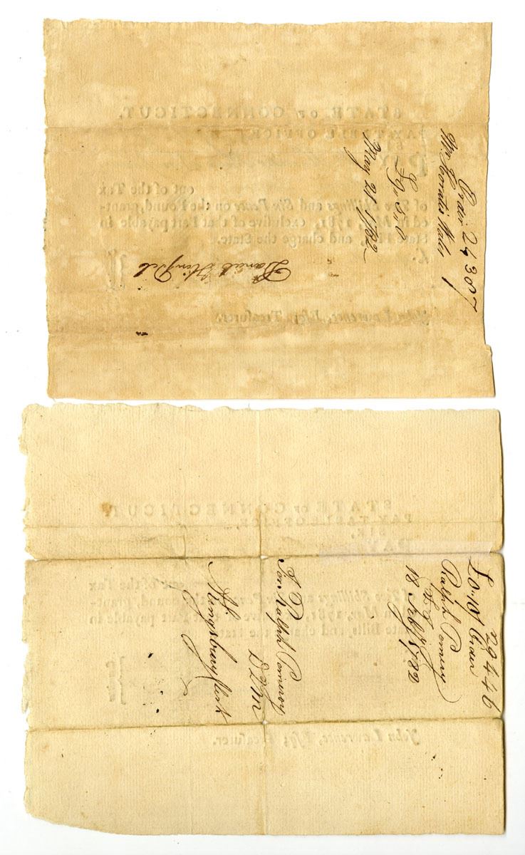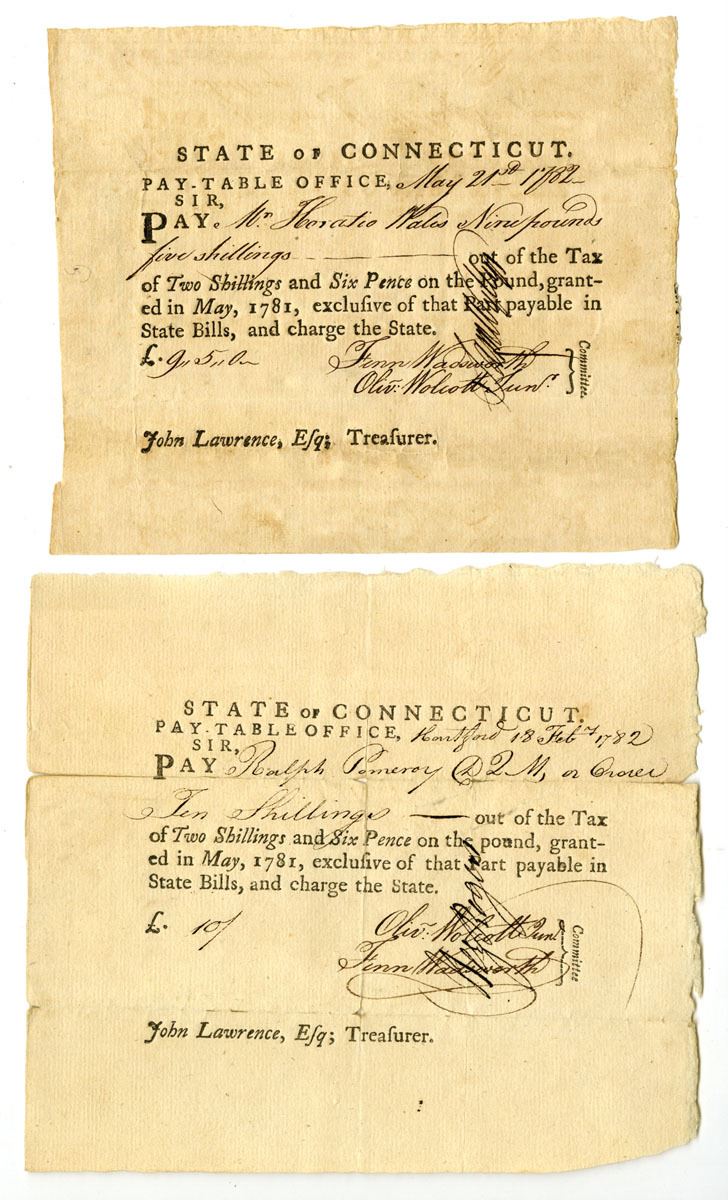 Hartford, Connecticut, 1782. Lot of 2 Tax Pay Orders Issued by the Pay-Table Office, Black print with black handwriting and signatures, Both are signed by early Connecticut leaders Fenn Wadsworth and Oliver Wolcott Jr. Fenn Wadsworth (1750/51-1785) was a brigade major to General James Wadsworth from 1776 to 1779. Oliver Wolcott Jr. (1760-1833) was the second United States Secretary of the Treasury, a judge of the United States Circuit Court for the Second Circuit, and the 24th Governor of Connecticut. VF condition. (2).