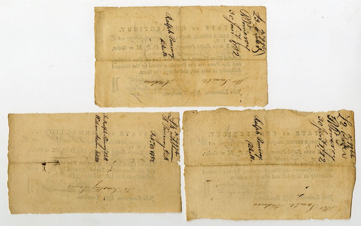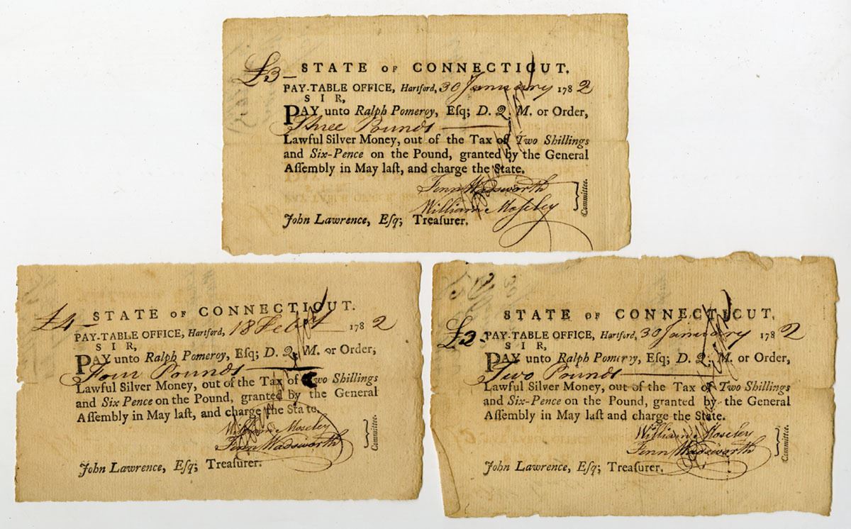 Hartford, Connecticut, 1781. Lot of 3 Tax Pay Orders Issued by the Pay-Table Office. Black print, handwriting, and signatures, all issued to Ralph Pomeroy for sums "granted by the General Assembly in May last, and charge the state." All are signed by William Moseley and Fenn Wadsworth. William Moseley (1755-1824) later would serve in the Connecticut state senate. Fenn Wadsworth (1750/51-1785) was a brigade major to General James Wadsworth from 1776 to 1779. He fought in many battles during that time, but his failing health forced him to leave active service. (3) Sold "AS IS" no returns accepted.