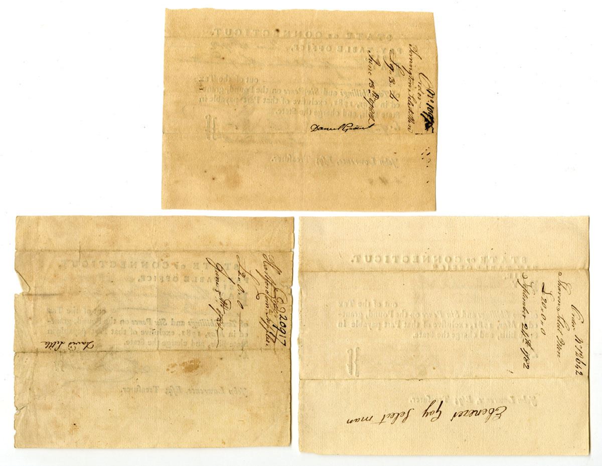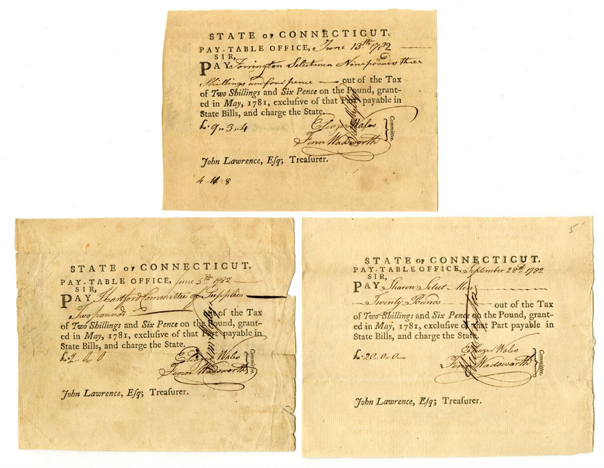Hartford, Connecticut, 1782. Lot of 3 Tax Pay Orders Issued by the Pay-Table Office, Black print with black handwriting and signatures, All are signed by Eleazer Wales and Fenn Wadsworth. Wales who was a graduate of Yale and Presbyterian Minister who also later served as a Justice of the Peace in Hartford. He remained involved in state politics, acting as State Controller after the war. Fenn Wadsworth (1750/51-1785) was a brigade major to General James Wadsworth from 1776 to 1779. He fought in many battles during that time, but his failing health forced him to leave active service. The Pay-Table (also known as the Committee of Four) managed Connecticut's military finances during the Revolutionary War. Financing the Revolution laid a heavy burden upon each colony, especially those which balked at levying taxes. In order to meet immediate needs, such as wages, the colonies relied upon wealthy revolutionists, foreign loans, and taxes and gifts from abroad. Issuing notes such as these was only a temporary solution. (3). Sold "AS IS" no returns accepted.