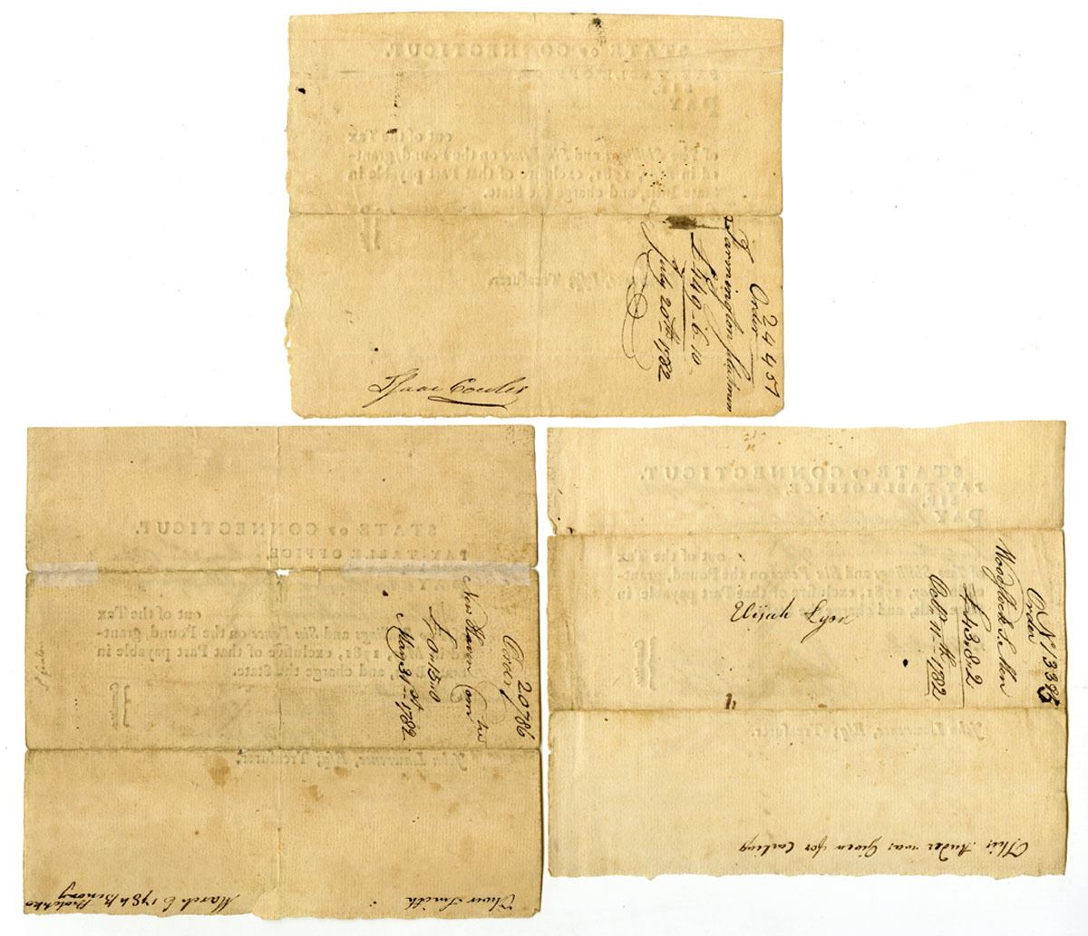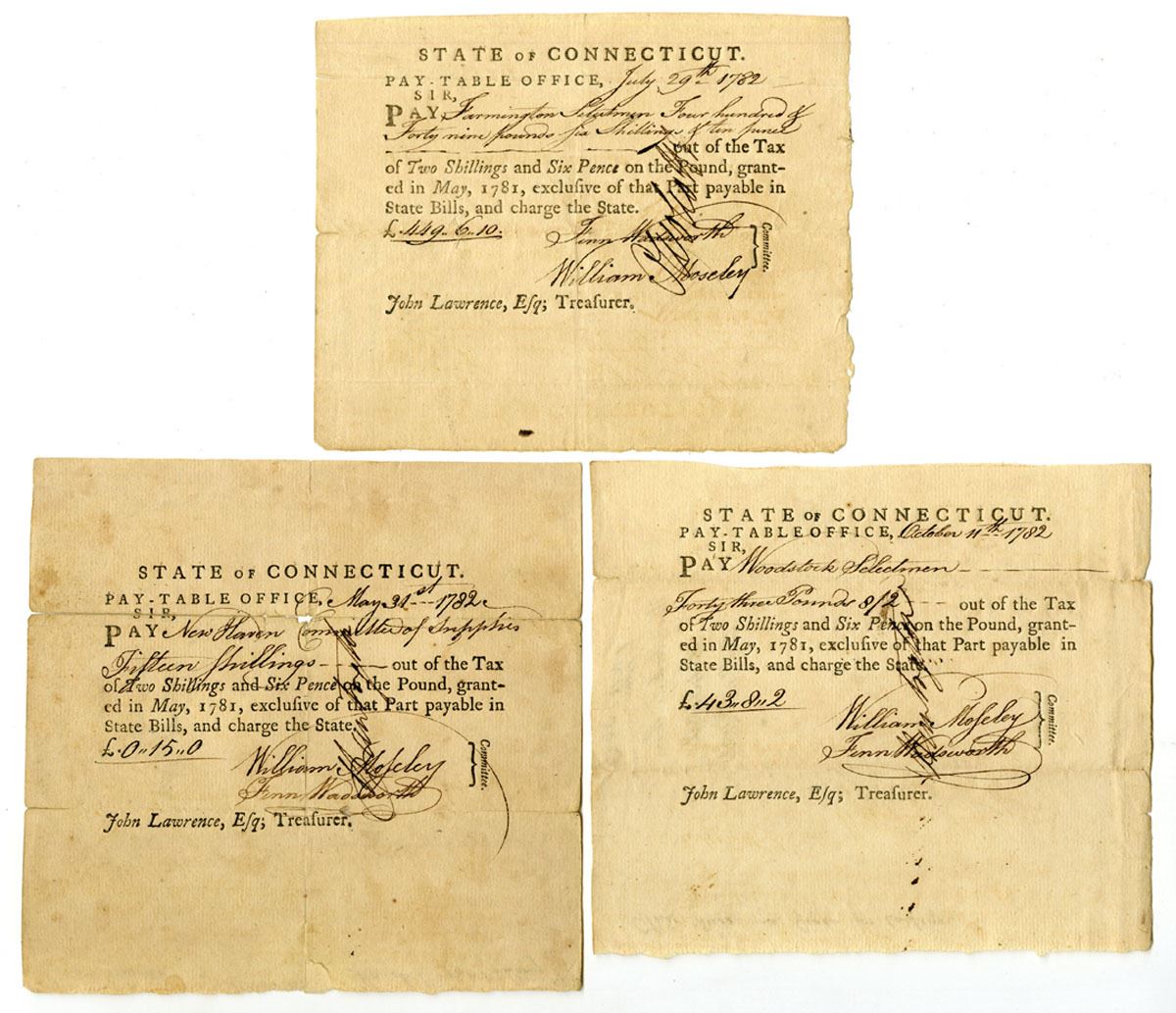 Hartford, Connecticut, 1782. Lot of 3 Tax Pay Orders Issued by the Pay-Table Office, Black print with black handwriting and signatures, All are signed by William Mosley and Fenn Wadsworth. William Moseley (1755-1824) later would serve in the Connecticut state senate and Fenn Wadsworth (1750/51-1785) was a brigade major to General James Wadsworth from 1776 to 1779. He fought in many battles during that time, but his failing health forced him to leave active service. The Pay-Table (also known as the Committee of Four) managed Connecticut's military finances during the Revolutionary War. Financing the Revolution laid a heavy burden upon each colony, especially those which balked at levying taxes. In order to meet immediate needs, such as wages, the colonies relied upon wealthy revolutionists, foreign loans, and taxes and gifts from abroad. Issuing notes such as these was only a temporary solution. (3). Sold "AS IS" no returns accepted.