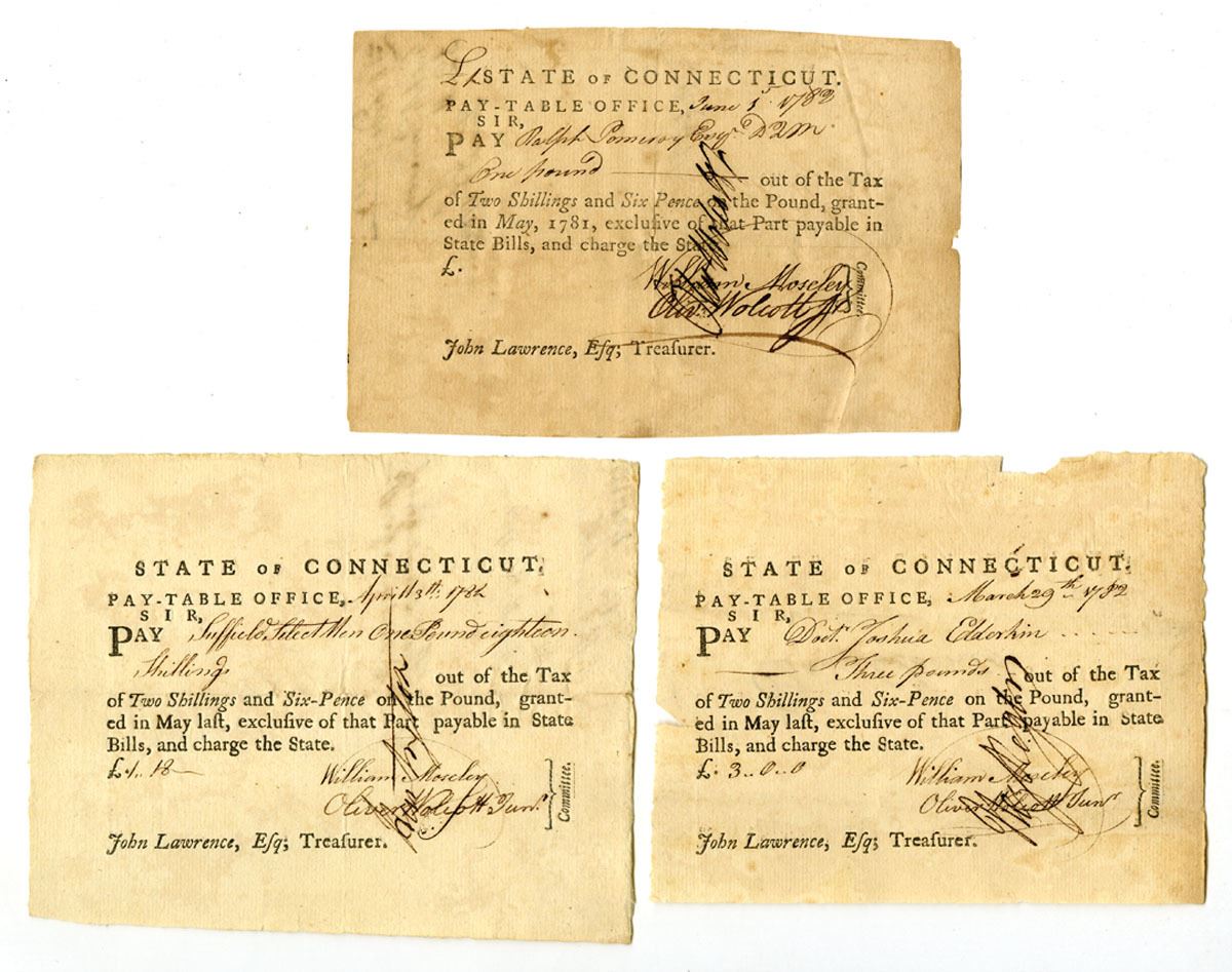 Hartford, Connecticut, 1782. Lot of 3 Tax Pay Orders Issued by the Pay-Table Office, Black print with black handwriting and signatures, All are signed by William Moseley and Oliver Wolcott. William Moseley (1755-1824) later would serve in the Connecticut state senate. Oliver Wolcott Jr. (1760-1833), who was the second United States Secretary of the Treasury, a judge of the United States Circuit Court for the Second Circuit, and the 24th Governor of Connecticut. The Pay-Table (also known as the Committee of Four) managed Connecticut's military finances during the Revolutionary War. Financing the Revolution laid a heavy burden upon each colony, especially those which balked at levying taxes. In order to meet immediate needs, such as wages, the colonies relied upon wealthy revolutionists, foreign loans, and taxes and gifts from abroad. Issuing notes such as these was only a temporary solution. All are in VF condition. (3). Sold "AS IS" no returns accepted.