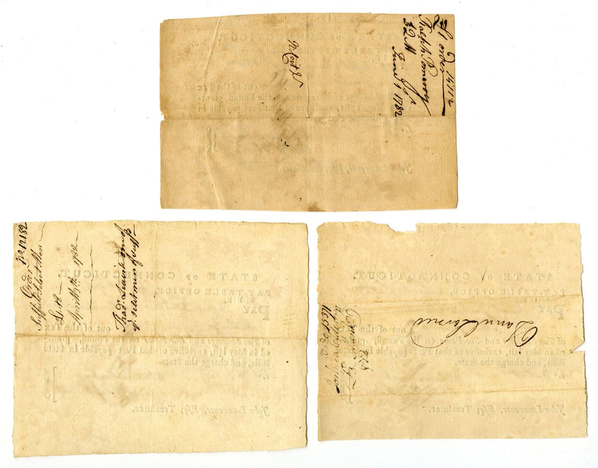 Hartford, Connecticut, 1782. Lot of 3 Tax Pay Orders Issued by the Pay-Table Office, Black print with black handwriting and signatures, All are signed by William Moseley and Oliver Wolcott. William Moseley (1755-1824) later would serve in the Connecticut state senate. Oliver Wolcott Jr. (1760-1833), who was the second United States Secretary of the Treasury, a judge of the United States Circuit Court for the Second Circuit, and the 24th Governor of Connecticut. The Pay-Table (also known as the Committee of Four) managed Connecticut's military finances during the Revolutionary War. Financing the Revolution laid a heavy burden upon each colony, especially those which balked at levying taxes. In order to meet immediate needs, such as wages, the colonies relied upon wealthy revolutionists, foreign loans, and taxes and gifts from abroad. Issuing notes such as these was only a temporary solution. All are in VF condition. (3). Sold "AS IS" no returns accepted.