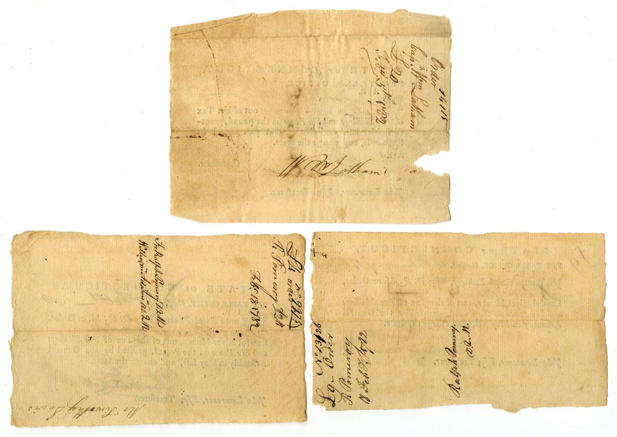 Hartford, Connecticut, 1782. Lot of 3 Tax Pay Orders Issued by the Pay-Table Office, Black print with black handwriting and signatures, All are signed by William Moseley and Fenn Wadsworth. William Moseley (1755-1824) later would serve in the Connecticut state senate. Fenn Wadsworth (1750/51-1785) was a brigade major to General James Wadsworth from 1776 to 1779. The Pay-Table (also known as the Committee of Four) managed Connecticut's military finances during the Revolutionary War. Financing the Revolution laid a heavy burden upon each colony, especially those which balked at levying taxes. In order to meet immediate needs, such as wages, the colonies relied upon wealthy revolutionists, foreign loans, and taxes and gifts from abroad. Issuing notes such as these was only a temporary solution. All are in VF condition. (3). Sold "AS IS" no returns accepted.