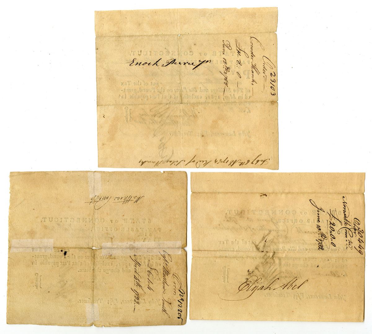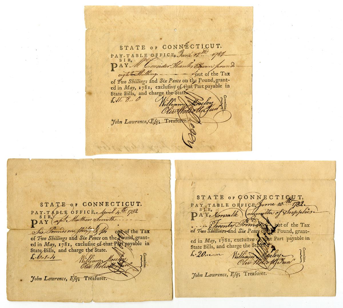 Hartford, Connecticut, 1782. Lot of 3 Tax Pay Orders Issued by the Pay-Table Office, Black print with black handwriting and signatures, All are signed by William Moseley and Oliver Wolcott. William Moseley (1755-1824) later would serve in the Connecticut state senate. Oliver Wolcott Jr. (1760-1833), who was the second United States Secretary of the Treasury, a judge of the United States Circuit Court for the Second Circuit, and the 24th Governor of Connecticut. The Pay-Table (also known as the Committee of Four) managed Connecticut's military finances during the Revolutionary War. Financing the Revolution laid a heavy burden upon each colony, especially those which balked at levying taxes. In order to meet immediate needs, such as wages, the colonies relied upon wealthy revolutionists, foreign loans, and taxes and gifts from abroad. Issuing notes such as these was only a temporary solution. All are in VF condition. (3).