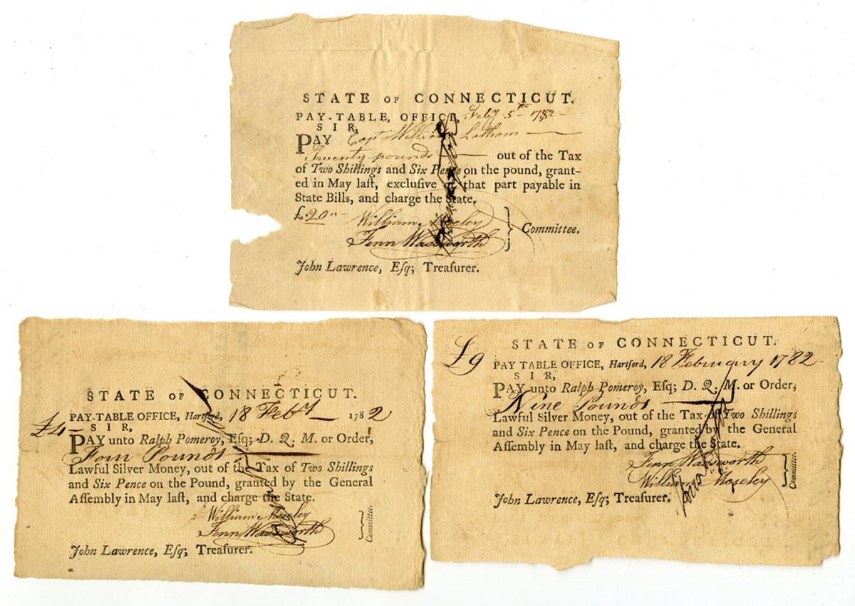 Hartford, Connecticut, 1782. Lot of 3 Tax Pay Orders Issued by the Pay-Table Office, Black print with black handwriting and signatures, All are signed by William Moseley and Fenn Wadsworth. William Moseley (1755-1824) later would serve in the Connecticut state senate. Fenn Wadsworth (1750/51-1785) was a brigade major to General James Wadsworth from 1776 to 1779. The Pay-Table (also known as the Committee of Four) managed Connecticut's military finances during the Revolutionary War. Financing the Revolution laid a heavy burden upon each colony, especially those which balked at levying taxes. In order to meet immediate needs, such as wages, the colonies relied upon wealthy revolutionists, foreign loans, and taxes and gifts from abroad. Issuing notes such as these was only a temporary solution. All are in VF condition. (3). Sold "AS IS" no returns accepted.