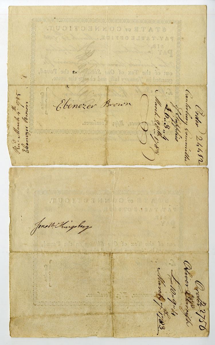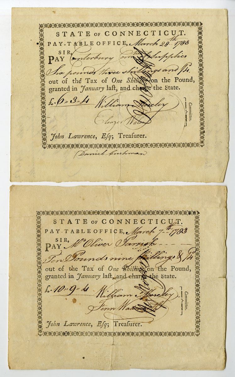 Hartford, Connecticut, 1783. Lot of 2 Issued Tax Pay Orders from the Pay-Table Office. Black text with black handwriting and signatures, One issued to the Canterbury Committee of Supplies; the other to Mr. Oliver Parrish. The pair includes signatures from William Moseley, Fenn Wadsworth, Eleazer Wales, and Oliver Wolcott Jr. The Connecticut Pay-Table Office was an integral part of Connecticut's post-Revolutionary administrative and financial governance. William Moseley (1755-1824) later would serve in the Connecticut state senate. He was also the Director of the Hartford National Bank from 1797 to 1815. Fenn Wadsworth (1750/51-1785) was a brigade major to General James Wadsworth from 1776 to 1779. Oliver Wolcott Jr. (1760-1833) was the second United States Secretary of the Treasury, a judge of the United States Circuit Court for the Second Circuit, and the 24th Governor of Connecticut. VF condition. Interesting certificate of Revolutionary Connecticut history with signatures from leading figures of the time. (2). Sold "AS IS" no returns accepted.