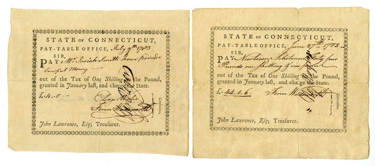 Hartford, Connecticut, 1783. Lot of 2 Tax Pay Orders Issued by the Pay-Table Office, Black print with black handwriting and signatures, Both are signed by early Connecticut leader Fenn Wadsworth, while one is also signed by Eleazer Wales. Fenn Wadsworth (1750/51-1785) was a brigade major to General James Wadsworth from 1776 to 1779. He fought in many battles during that time, but his failing health forced him to leave active service. Wadsworth stayed in Connecticut's government, as shown by his membership to the Pay-Table Committee. Eleazer Wales was a colonial Connecticut official and merchant who served as a member of the Pay-Table, the committee responsible for overseeing the issuance and redemption of colonial paper currency. His signature on colonial notes reflects official fiscal authorization and governmental oversight during the mid-18th century. Certificates are in VF to XF condition. (2). Sold "AS IS" no returns accepted.