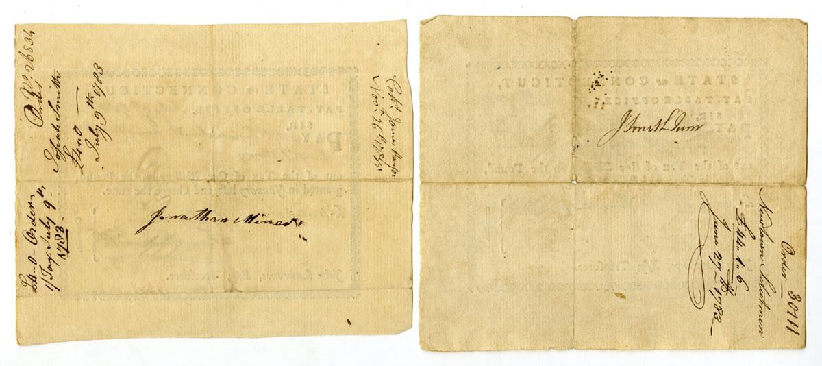 Hartford, Connecticut, 1783. Lot of 2 Tax Pay Orders Issued by the Pay-Table Office, Black print with black handwriting and signatures, Both are signed by early Connecticut leader Fenn Wadsworth, while one is also signed by Eleazer Wales. Fenn Wadsworth (1750/51-1785) was a brigade major to General James Wadsworth from 1776 to 1779. He fought in many battles during that time, but his failing health forced him to leave active service. Wadsworth stayed in Connecticut's government, as shown by his membership to the Pay-Table Committee. Eleazer Wales was a colonial Connecticut official and merchant who served as a member of the Pay-Table, the committee responsible for overseeing the issuance and redemption of colonial paper currency. His signature on colonial notes reflects official fiscal authorization and governmental oversight during the mid-18th century. Certificates are in VF to XF condition. (2). Sold "AS IS" no returns accepted.