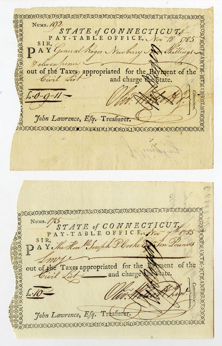 Hartford, Connecticut, 1785. Lot of 2 Tax Pay Orders Issued by the Pay-Table Office, Black print with black handwriting and signatures, One issued to General Roger Newberry for 9 Shillings 11 Pence; the other to the Honorable Joseph P. Cooke for 10 Pounds. Both have signatures from early Connecticut figure Oliver Wolcott Jr. (1760-1833), who was the second United States Secretary of the Treasury, a judge of the United States Circuit Court for the Second Circuit, and the 24th Governor of Connecticut. Both are in VF condition. Sold "AS IS" no returns accepted. (2)