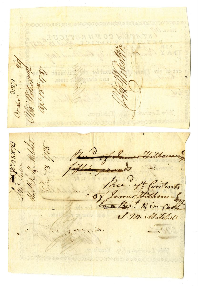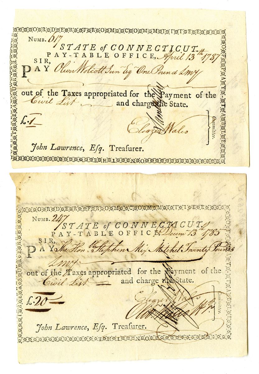 Hartford, Connecticut, 1785 & 1787. Lot of 2 Issued Tax Pay Orders from the Pay-Table Office. Black text with black handwriting and signatures, The pair includes signatures from Early Connecticut Figures Eleazer Wales, Stephen Mix Mitchell, and Oliver Wolcott Jr. Oliver Wolcott Jr. (1760-1833), who was the second United States Secretary of the Treasury, a judge of the United States Circuit Court for the Second Circuit, and the 24th Governor of Connecticut. Eleazer Wales was graduate of Yale and Presbyterian Minister who also later served as a Justice of the Peace in Hartford. He remained involved in state politics, acting as State Controller after the war. Stephen Mix Mitchell, also a Yale graduate, served as a member of the Connecticut House of Representatives from 1778-1784, an associate Justice of the county court, delegate from Connecticut to the Continental Congress from 1783 to 1788 and a member of the Connecticut Convention which on January 9, 1788 ratified the U.S. Constitution. He was also a U.S. Senator from 1793 to 1795. The Pay-Table (also known as the Committee of Four) managed Connecticut's military finances during the Revolutionary War. Financing the Revolution laid a heavy burden upon each colony, especially those which balked at levying taxes. In order to meet immediate needs, such as wages, the colonies relied upon wealthy revolutionists, foreign loans, and taxes and gifts from abroad. Issuing notes such as these was only a temporary solution. Both are in VF condition. (2).