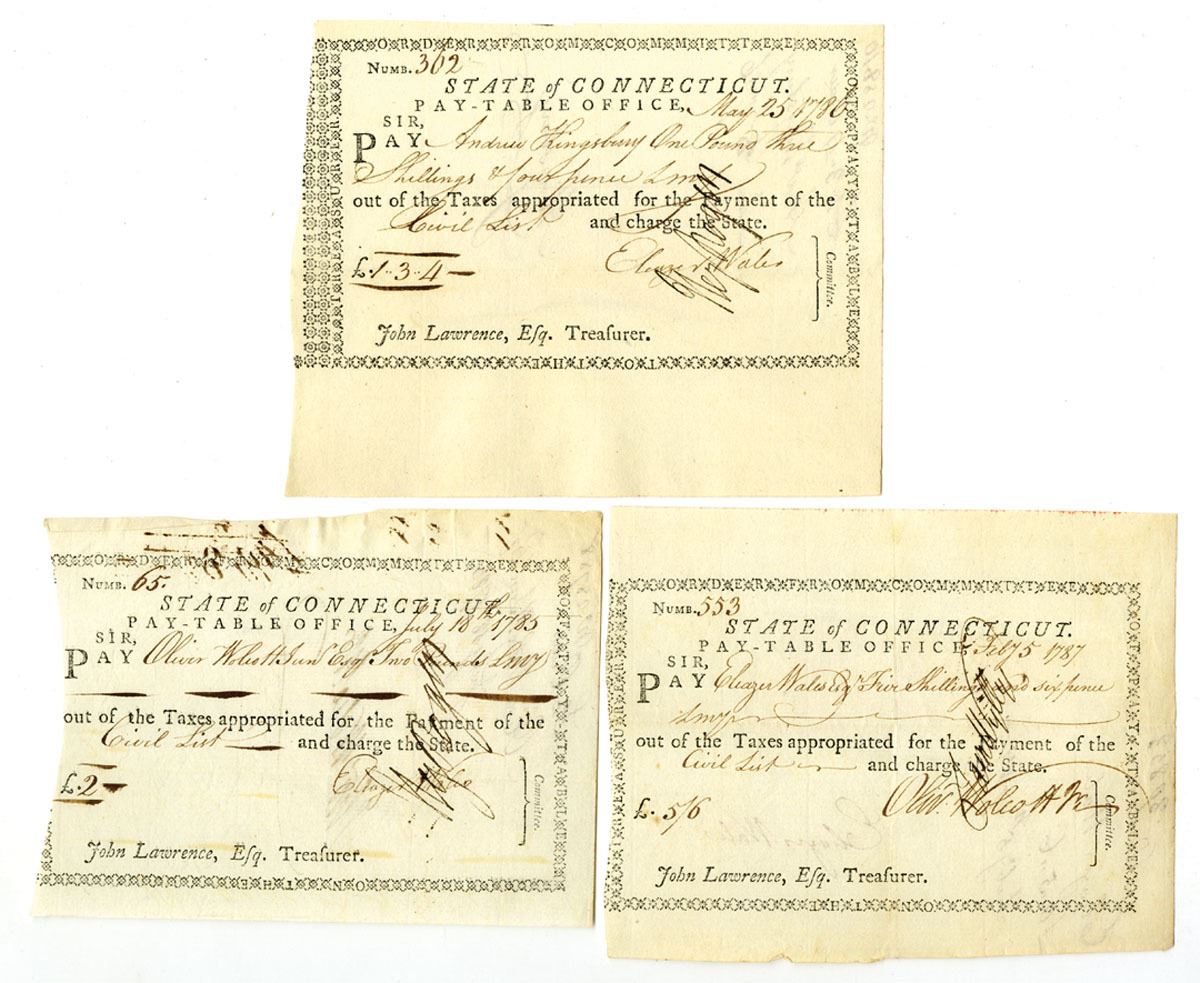 Hartford, Connecticut, 1784-86. Lot of 3 Tax Pay Orders Issued by the Pay-Table Office, Black print with black handwriting and signatures. One is made out to Eleazer Wales Esq, a second is made out to Oliver Wolcott, and the third is made out to Andrew Kingsbury. Oliver Wolcott Jr. (1760-1833), who was the second United States Secretary of the Treasury, a judge of the United States Circuit Court for the Second Circuit, and the 24th Governor of Connecticut. Eleazer Wales was graduate of Yale and Presbyterian Minister who also later served as a Justice of the Peace in Hartford. He remained involved in state politics, acting as State Controller after the war. Andrew Kingsbury (1759Ð1837) was an important Connecticut official who served as State Treasurer from 1794 to 1818. He played a key role in managing the stateÕs finances during the post-Revolutionary and early federal period. The Pay-Table (also known as the Committee of Four) managed Connecticut's military finances during the Revolutionary War. Financing the Revolution laid a heavy burden upon each colony, especially those which balked at levying taxes. In order to meet immediate needs, such as wages, the colonies relied upon wealthy revolutionists, foreign loans, and taxes and gifts from abroad. Issuing notes such as these was only a temporary solution. All are in VF condition. (3). Sold "AS IS" no returns accepted.