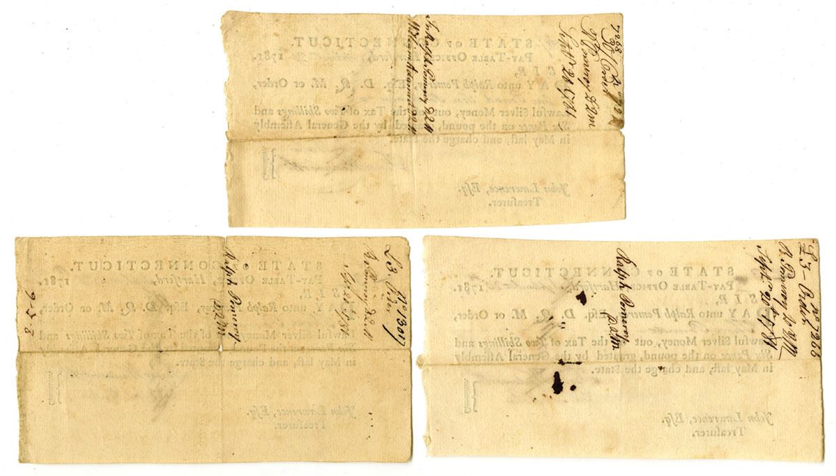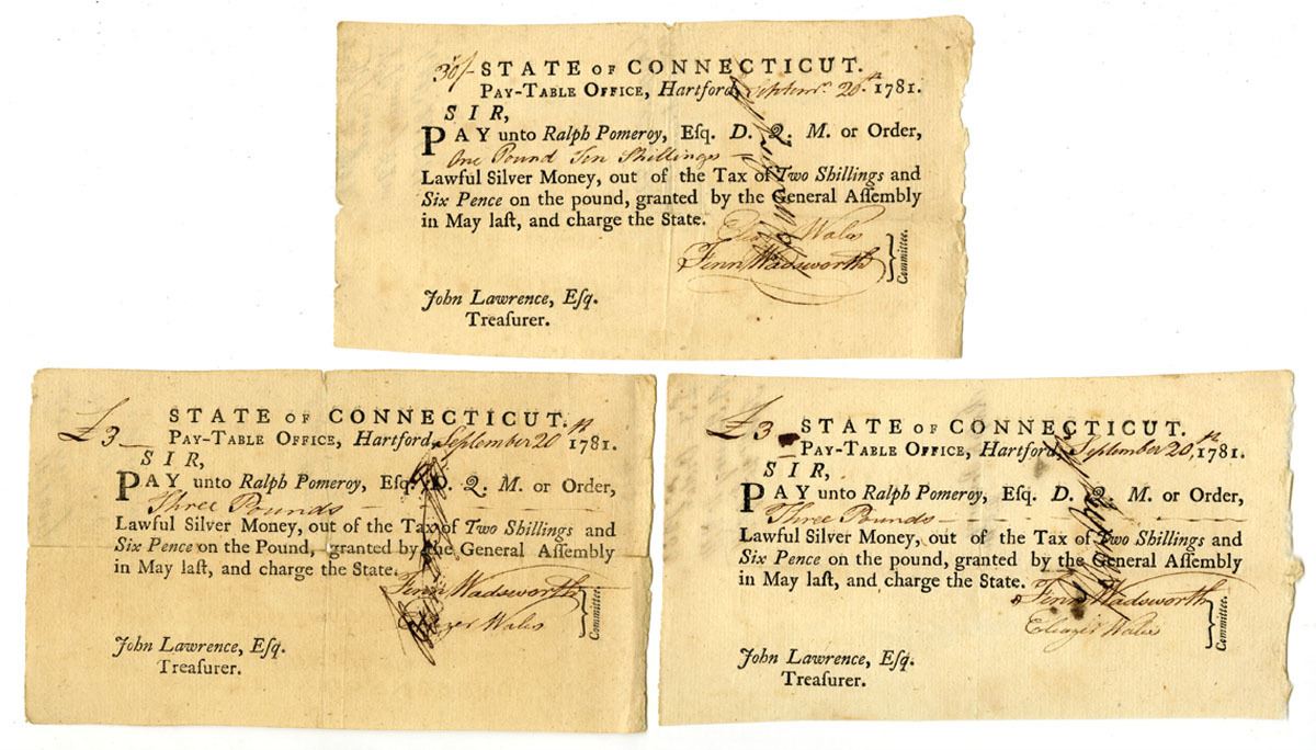Hartford, Connecticut, 1781. Lot of 3 Promissory Notes both issued to Ralph Pomeroy issued by the Pay-Table Office in Hartford. One receipt is issued for £8 and the other is for 25 Shillings. Both are signed by Eliazer Wales and William Mosely, and also signed by Pay-Table member Jedediah (or Jedidiah) Huntington over printed text. Black text with black handwriting on front and back. The Pay-Table (also known as the Committee of Four) managed Connecticut's military finances during the Revolutionary War. Financing the Revolution laid a heavy burden upon each colony, especially those which balked at levying taxes. In order to meet immediate needs, such as wages, the colonies relied upon wealthy revolutionists, foreign loans, and taxes and gifts from abroad. Issuing notes such as these was only a temporary solution. William Moseley (1755-1824) later would serve in the Connecticut state senate, while Eleazer Wales was another member of the Pay-Table. Ralph Pomeroy, who was to receive the payment, was a paymaster in the Continental Army. He remained involved in state politics, acting as State Controller after the war. Fine condition, Interesting pair from early United States history. (3). Sold "AS IS" no returns accepted.