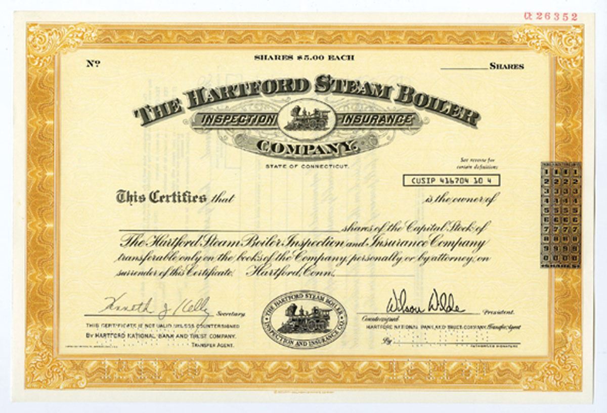 CT. Hartford Steam Boiler Inspection Insurance Co., 1982 Specimen Stock Cert, XF, Early Railroad related insurance company