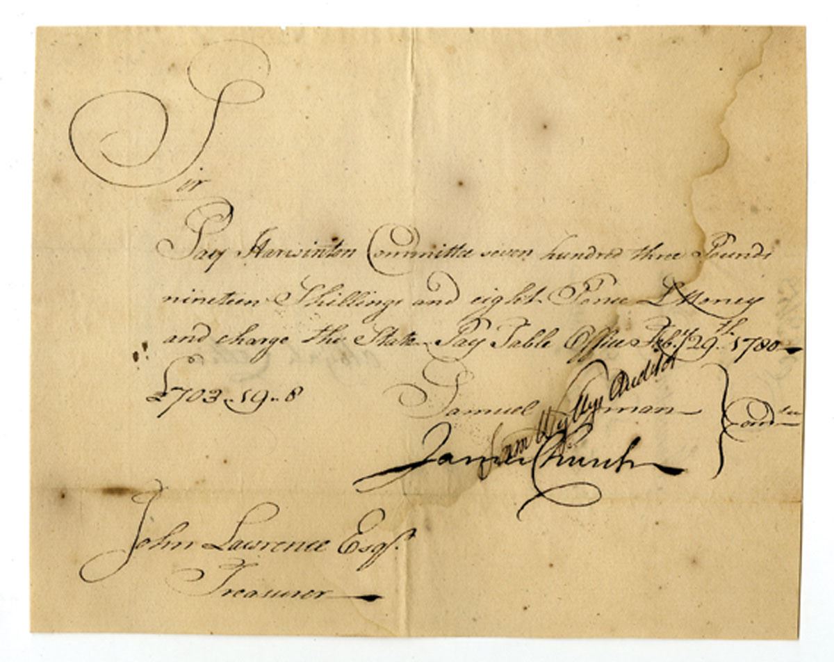 Connecticut, Feb 29, 1780. Revolutionary War, State of Connecticut, Pay-Table Office Order directing Treasurer John Lawrence Esq. to pay Harwinton Committee seven hundred pounds nineteen shillings and eight pence L money and charge the State Pay-Table Office; manuscript-signed by Samuel Lyman and John Church, with cross-signature approval by Samuel Wyllys, Auditor; classic Revolutionary War financial form used to reimburse towns for wartime expenses, fully handwritten on laid paper with period ink, showing typical docketing and endorsement. Designs feature bold colonial penmanship and treasurer’s notation. Conditions range from VF to XF with expected folds and minor stains, handling, and minor edge wear consistent with eighteenth-century fiscal use.
