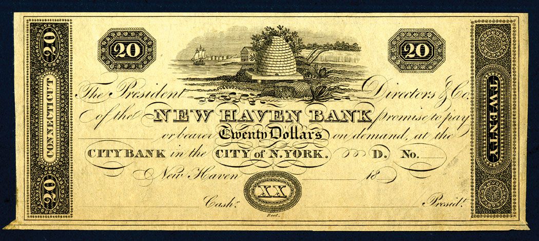 New Haven, CT. (CT-290-G304) Proof only issue, Bee hive on top, black on thin off white india paper, Uncirculated to CU condition. Reed, Rare proof only note. (ex. Smythe, July 11, 2006, Lot 1020, Sold $805)