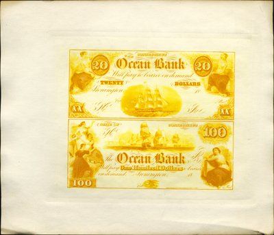 Stonington, CT. ca.1850's. $20; $100. Proof sheet of 2 notes printed on large card. $20 and $100 notes with Toppan, Carpenter and Casilear & Co. imprint. Printed in bright yellow with no undertint. Similar to design of Haxby CT-410-G12 $20 and CT-410-G114 $100. Unlisted as a sheet in Haxby and both notes also listed as SENC. Condition appears choice uncirculated. TCC&C.