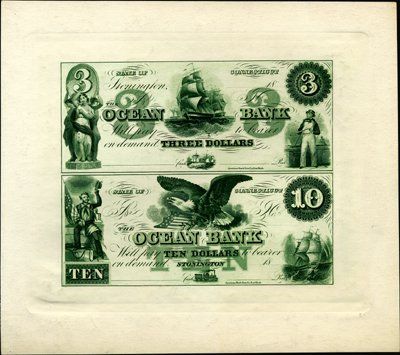 Stonington, CT. ca.1859-1860's. $3; $10. Proof sheet of 2 notes printed on large card. $3 and $10 notes with ABNC imprint. Printed in green with no undertint. Similar to design of Haxby CT-410-G6b $3 and CT-410-G10b $10 and also listed as uncut sheet X2, $3, $10 ABN. Condition appears choice uncirculated. ABNC.