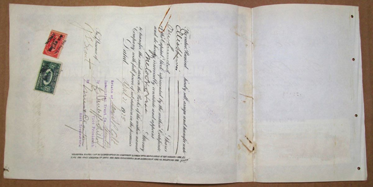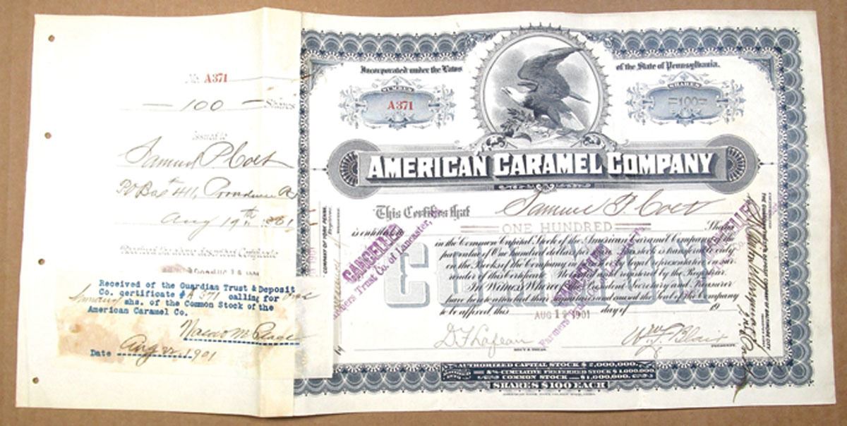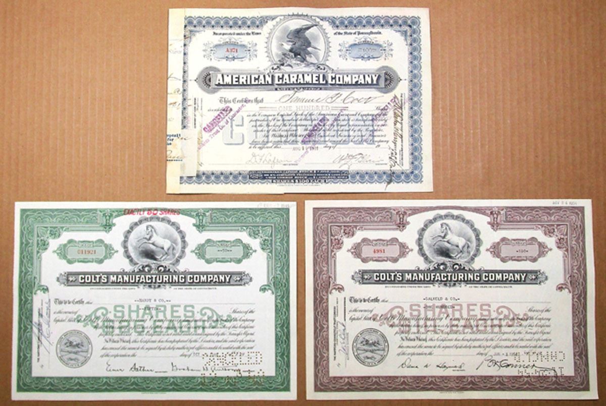 Connecticut & Pennsylvania, 1901 to 1954. Lot of 3 I/C Stock Certificates related to Samuel Colt, Includes 1901, American Caramel Co., I/C Stock Certificate for 100 Shares, made out to Samuel P Colt and signed by the Colt Estate in 1925 on the back; also included are a pair of Colt's Manufacturing Co. Stock Certificates dated 1949 and 1954. VF to XF condition. Samuel P. Colt was born in Paterson, New Jersey, on January 10, 1852, the youngest of six children born to Christopher Colt (brother to arms maker Samuel Colt and uncle to Samuel P Colt) and Theodora Goujand DeWolf Colt of Bristol, Rhode Island. His mother was a member of the large and wealthy DeWolf family, many of whom had profited from the slave trade and related businesses. Colt was an industrialist and politician from Rhode Island. He formed the United States Rubber Company, later called Uniroyal, the largest rubber company in the nation.(3). Sold "AS IS" no returns accepted.