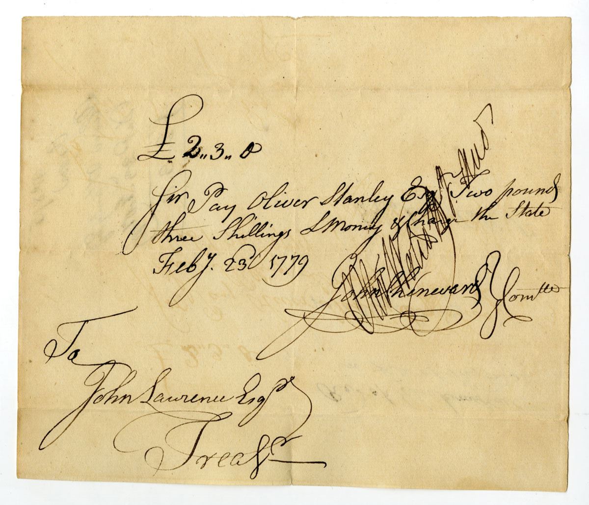 Hartford, Connecticut, February 23, 1779. 2 Pounds, 3 Shillings Promissory Note to help finance the Revolutionary War payable in Connecticut Bills, Note is signed by John Chenward, Olive Wolcott Jr., and John Lawrence. Military finances in the state of Connecticut were managed by the Pay-Table which was also known as the Committee of Four during the Revolutionary War. John Chenward (1733-1805) was a Captain in the army. Oliver Wolcott Jr. (January 11, 1760 - June 1, 1833) was the second United States Secretary of the Treasury, a judge of the United States Circuit Court for the Second Circuit, and the 24th Governor of Connecticut. He was a member of the Pay-Table Committee for several years, and was a commissioner to settle claims of Connecticut against the United States from 1784 to 1788. When Wolcott died in 1833 in New York City, he was the last surviving cabinet member of the Washington administration. John Lawrence (1719-1802) served as treasurer of the Connecticut colony, and later as the Connecticut State Treasurer from 1769 to 1789, spanning the crucial period of colonial rule, through the American revolution, and into the early years of the United States. During the Revolutionary War, Lawrence was commissioner of loans for the new nation. VF to XF condition. Interesting certificate of Revolutionary Connecticut history with signatures from leading figures of the time.