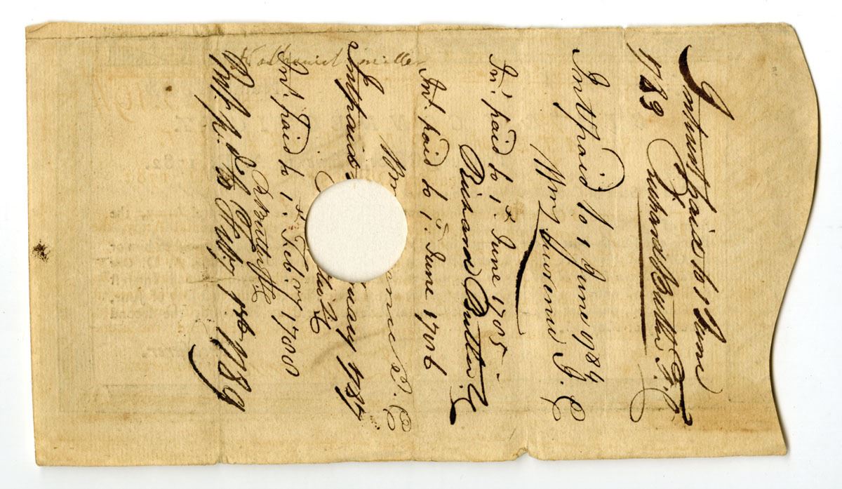 Hartford, Connecticut, 1782. 2 Pounds, 11 Shillings, 3 Pence I/C Payment Certificate for service in the Connecticut Line of the Continental Army, signed by John Lawrence as Treasurer of the State of Connecticut, Black text with black border, black writing on reverse, Large circular hole at center. John Lawrence (1719-1802) served as treasurer of the Connecticut colony, and later as the Connecticut State Treasurer from 1769 to 1789, spanning the crucial period of colonial rule, through the American revolution and into the early years of the United States. During the Revolutionary War, Lawrence was commissioner of loans for the new nation. VF to XF condition.