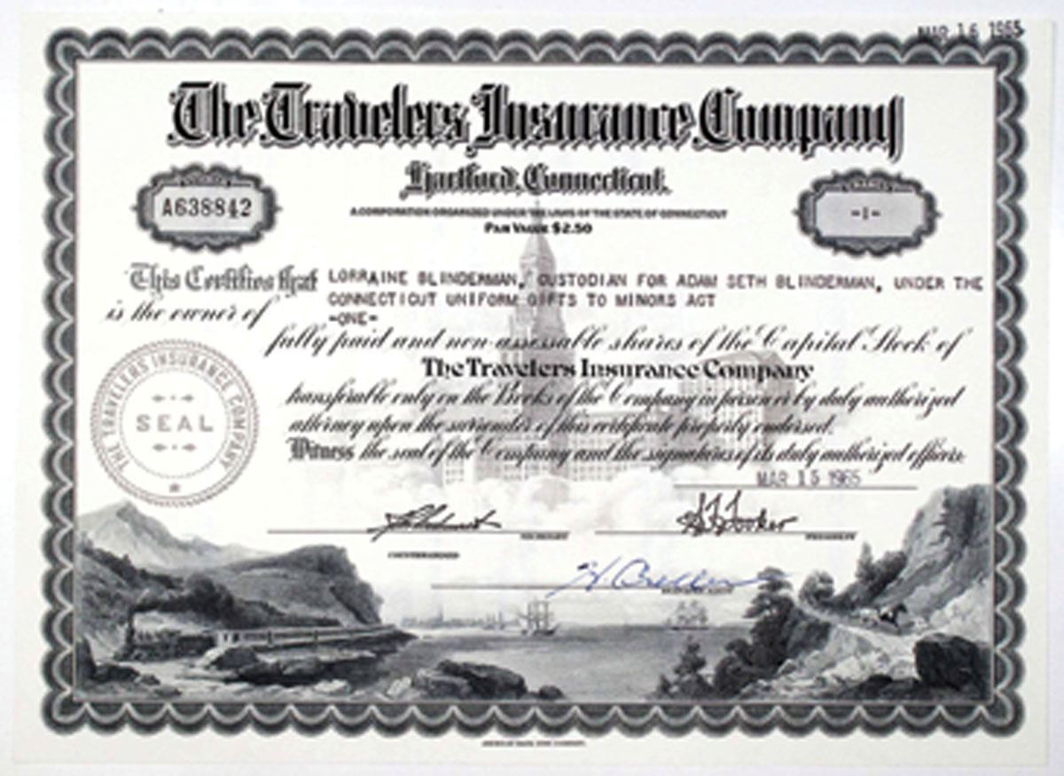 Connecticut, 1965. 1 Share I/U Capital Stock Certificate, Black text with gray border and ornate riverside scene at bottom, Building underprint at center. VF condition, ABNC. The Travelers Companies, Inc., commonly known as Travelers, is an American insurance company. It is the second-largest writer of U.S. commercial property casualty insurance, and the sixth-largest writer of U.S. personal insurance through independent agents.