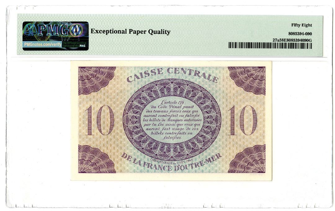 Guadeloupe. 1944. 10 Francs, P-27a, Issued banknote, Purple and multicolor, S/N GD902884 - Ovpt. "Guadeloupe", PMG graded Choice About Uncirculated 58 EPQ.