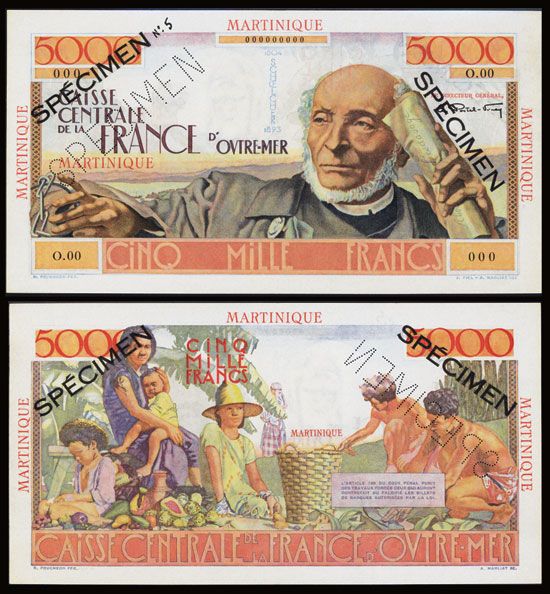 Martinique, ND (1952). 5000 Francs, P-34s, Specimen Banknote, M/C with General Schoelcher on right, back with group of people with basket and fruit. Black Specimen overprint, Ò000Ó Serial numbers and pin-punch ÒSpecimenÓ, PMG graded Ò64 Choice Uncirculated - EPQ (Exceptional Paper Quality)Ó. Overprinted ÒMartiniqueÓ on top and sides of front and back. Exceptional and extremely striking banknote that is rarely found this nice.
