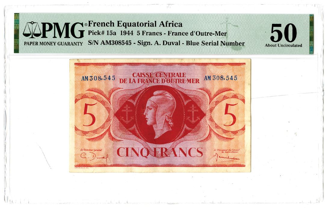 French Equatorial Africa, 1944. 5 Francs, P-15a, Issued Banknote. Red with portrait of Marianne at center with blue printed serial number. S/N AM308545. PMG graded About Uncirculated 50.