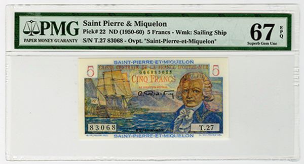 St. Pierre & Miquelon. Issued 5 Francs, ND (1950-1960), P-22, overprinted "Saint-Pierre-et-Miquelon". PMG graded Superb Gem Unc 67 EPQ.