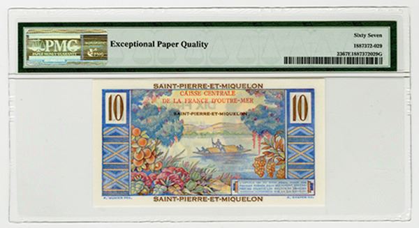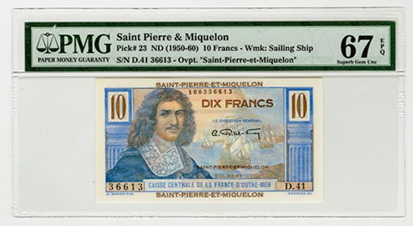 St. Pierre & Miquelon. Issued 10 Francs, ND (1950-1960), P-23, overprinted "Saint-Pierre-et-Miquelon". PMG graded Superb Gem Unc 67 EPQ.
