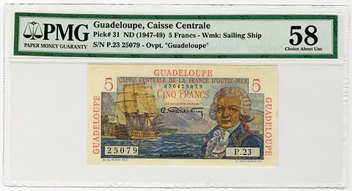 Guadeloupe. Issued 5 Francs, ND (1947-1949), P-31. PMG graded Choice About Unc 58 (Cert # 5003608-008).