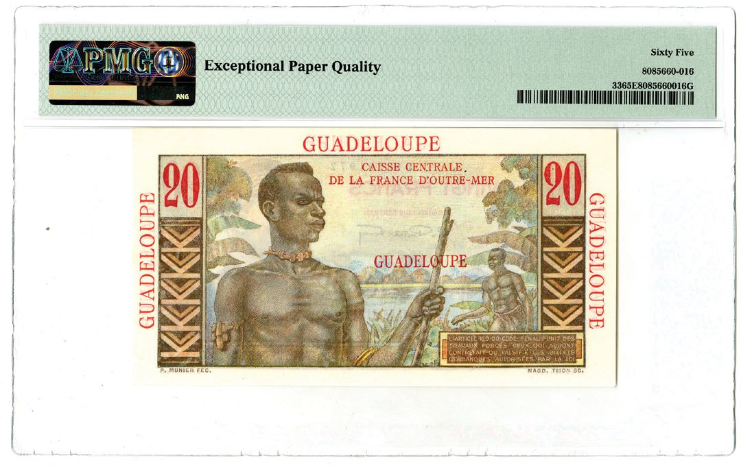 Guadeloupe. ND (1947-49). 20 Francs, P-33, Issued banknote, Brown on face, S/N L.6 91972, Watermark: Sailing Ship, Overprint "Guadeloupe", PMG graded Gem Uncirculated 65 EPQ.
