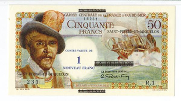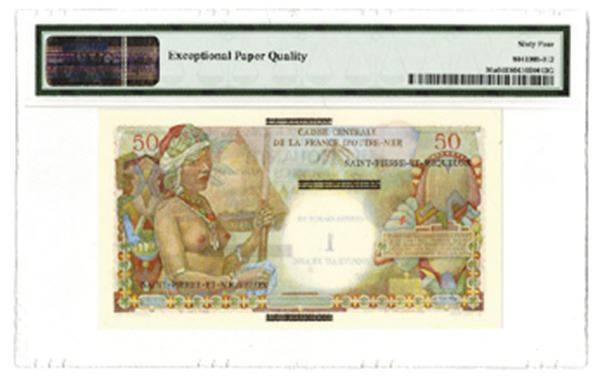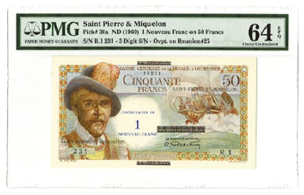 St. Pierre & Miquelon, issued 1 Nouveau Franc on 50 Francs, P-30a, overprinted on Reunion P-25, PMG graded Choice Uncirculated 64 EPQ.