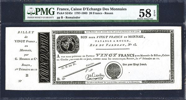France, 20 Francs, P-S245r, PMG graded Choice About Uncirculated 58 EPQ with the appearance of a CU note, attractive and fresh appearing note. This is the highest and only one graded by PMG. Scarce note rarely seen this nice.
