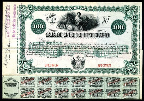 Chile, 19xx, 100 pesos, Specimen Bond, Black print with dark green border and underprint. Vignette top center of lady with sickle and lamb. Coupons Attached, POC, VF.