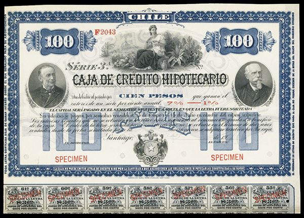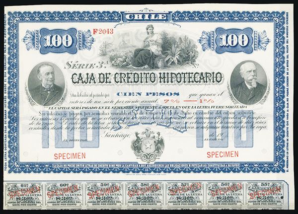 Chile, 19xx, (ca.1900-1920), 100 pesos, Specimen Bond, Blue Border with Allegorical Figure and Portraits, Coupons Attached, POC, VF-XF. ABNC.